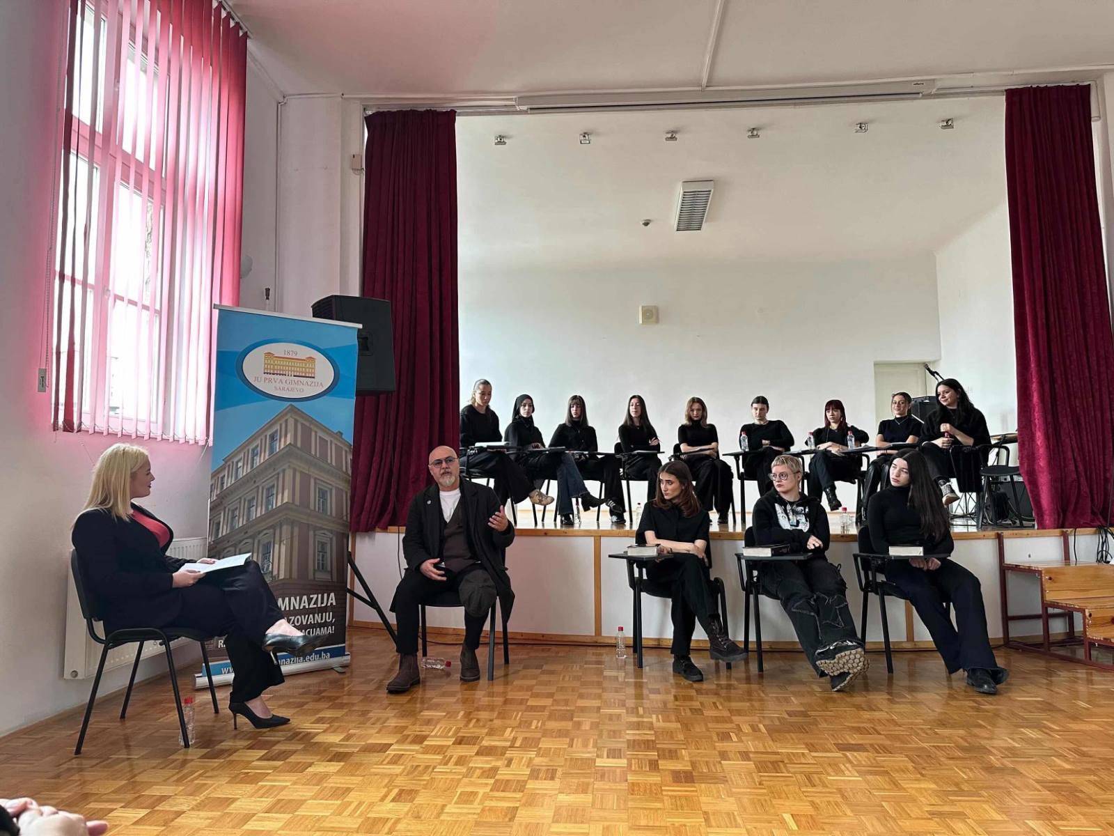 Učenice IVa razreda Prve gimnazije Sarajevo realizovale su 3. aprila 2026. godine u kinosali škole scensko čitanje dramskog teksta “Kad bi ovo bila predstava” autora Almira Imširevića. Kroz ovu izvedbu učenice su pokazale izražajno glumačko umijeće i osjetljivost za scenski govor. Posebnu vrijednost događaju dalo je prisustvo samog autora, ujedno i bivšeg učenika škole, koji...Read More