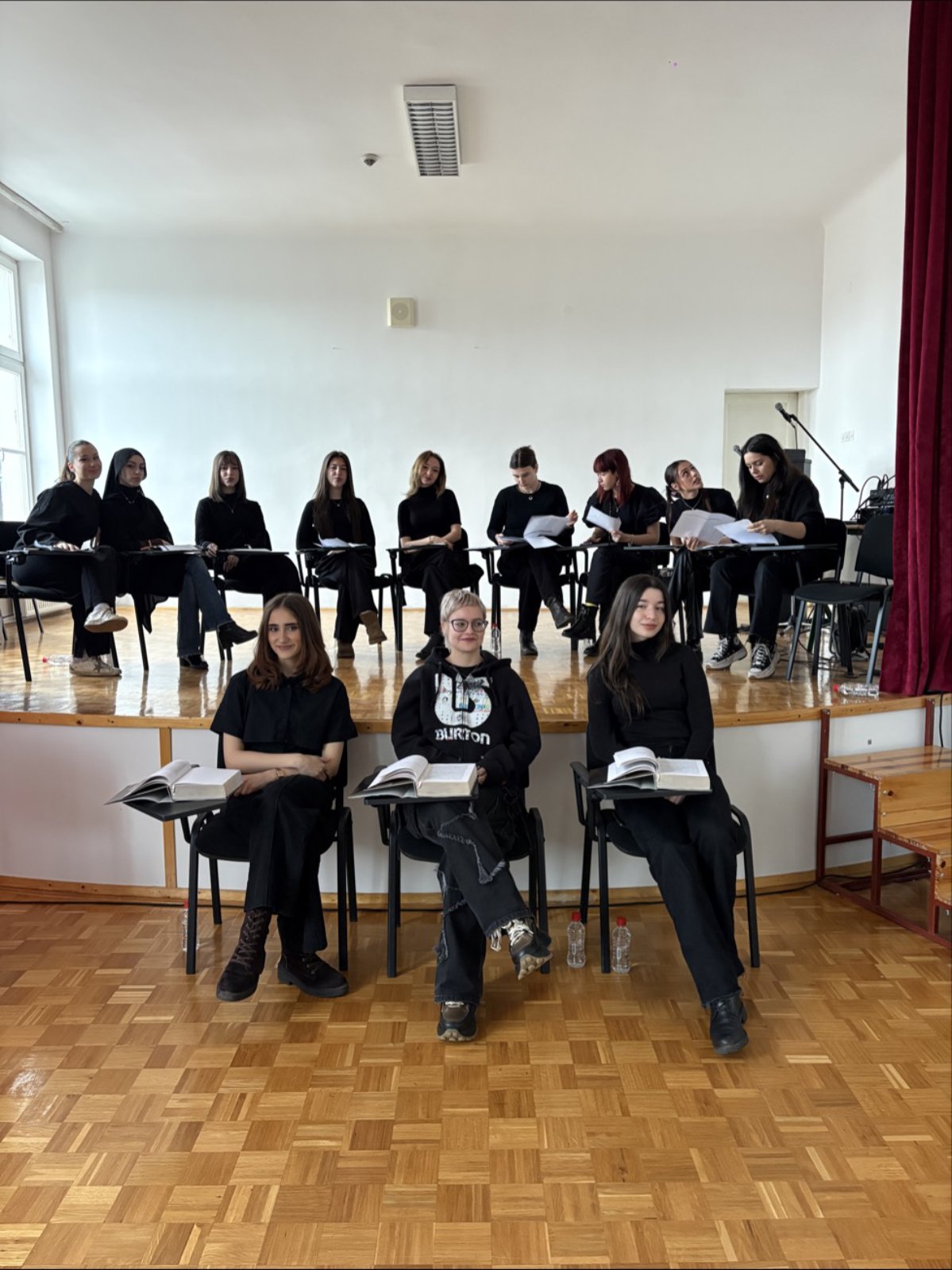 Učenice IVa razreda Prve gimnazije Sarajevo realizovale su 3. aprila 2026. godine u kinosali škole scensko čitanje dramskog teksta “Kad bi ovo bila predstava” autora Almira Imširevića. Kroz ovu izvedbu učenice su pokazale izražajno glumačko umijeće i osjetljivost za scenski govor.