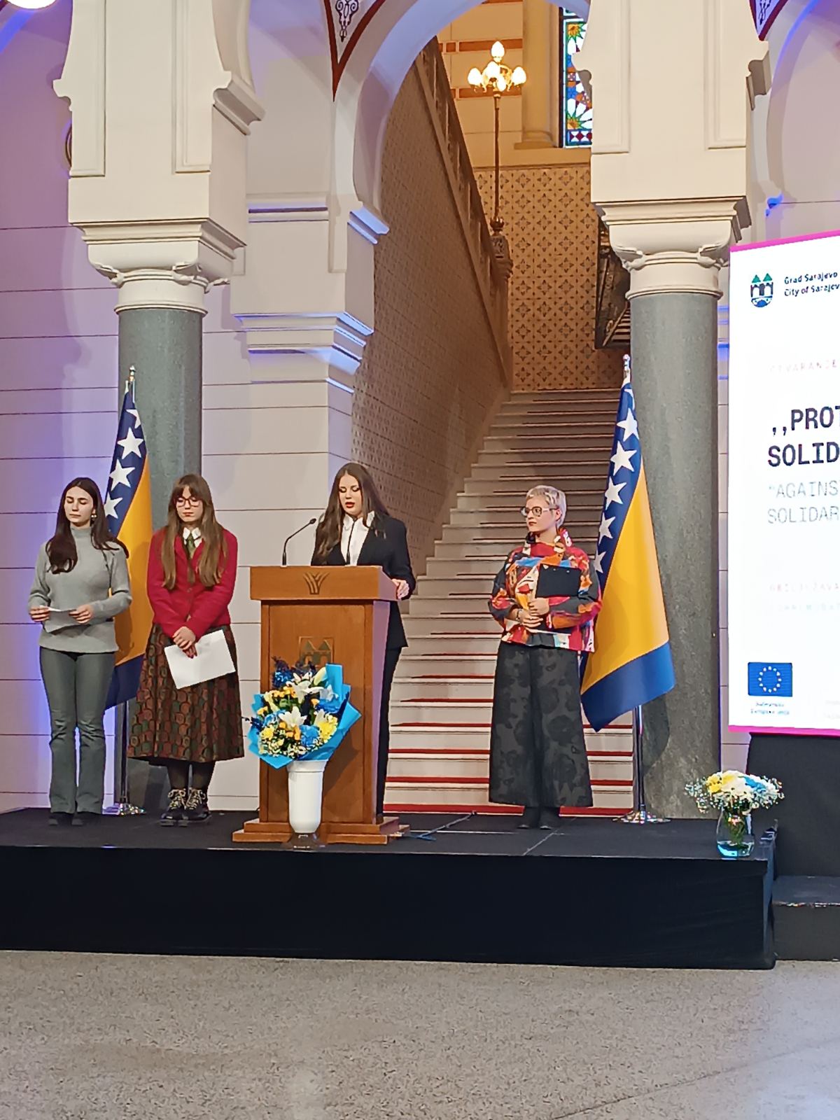 U okviru međunarodnog projekta “Against Forgetting: For Peace and Solidarity in Europe”, četiri učenice Prve gimnazije Sarajevo, Mona Hamzagić, Medina Brkić, Lamija Alagić i Nadin Jonuz, učestvovale su na edukativnoj radionici održanoj 26. marta 2026. godine u sarajevskoj Vijećnici. Radionicu je organizirala britanska organizacija Never Such Innocence u saradnji s Udruženjem “Obrazovanje gradi Bosnu i Hercegovinu – Jovan Divjak”.